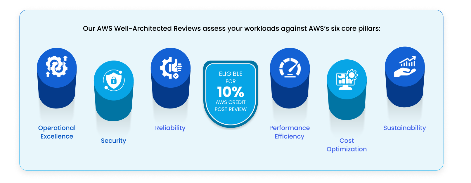 Our AWS Well-Architected Reviews assess your workloads against AWS’s six core pillars: